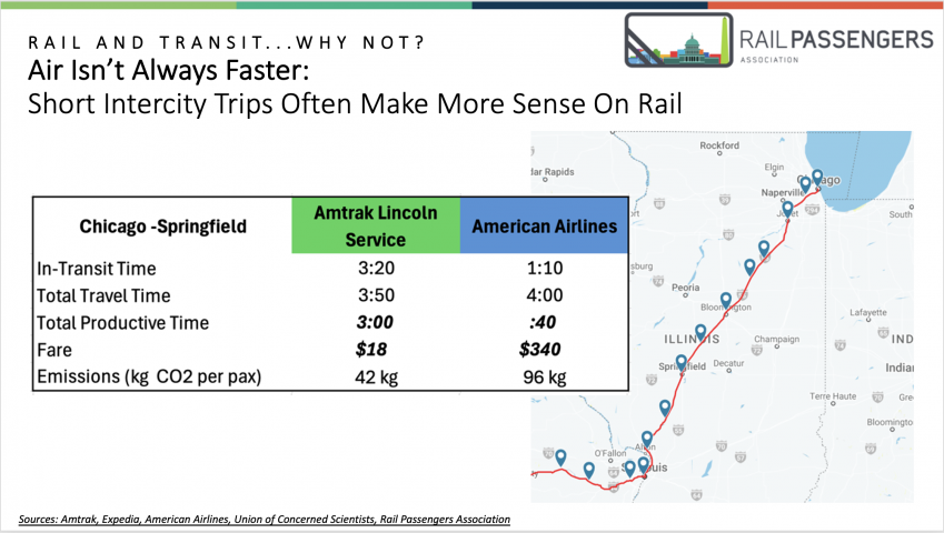And then there’s whole “why not just fly” argument. Earlier this year I presented to the Global Business Travel Association’s annual conference where I pointed to a typical trip between Chicago and the Illinois capital, Springfield. Take a look at the slide I put up for those folks this spring. Their jaws dropped. A $340 flight versus an $18 train ride.